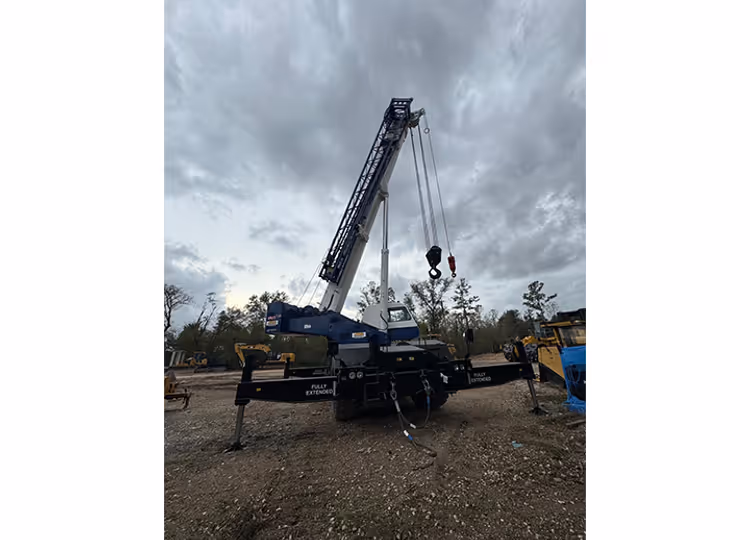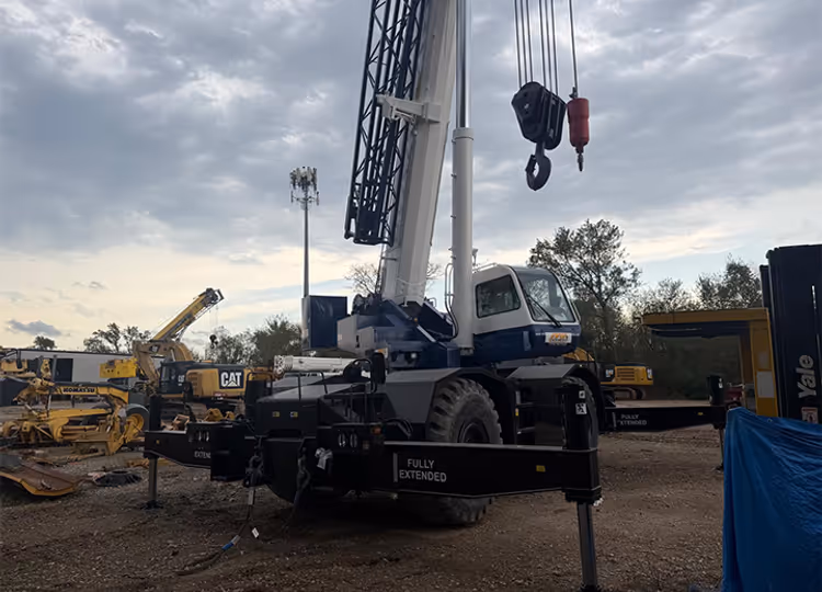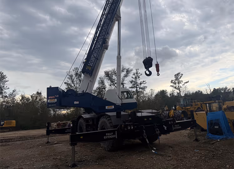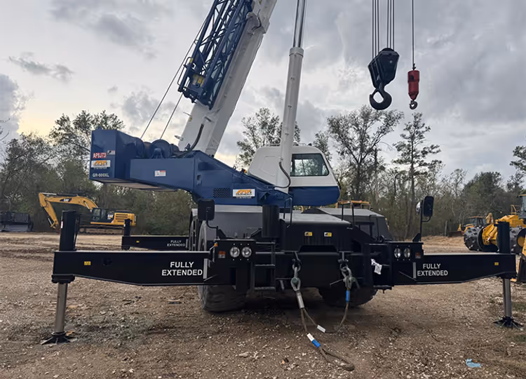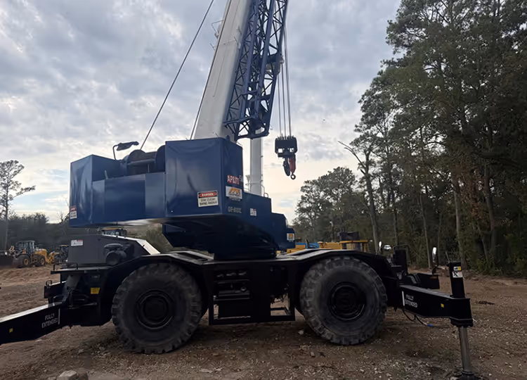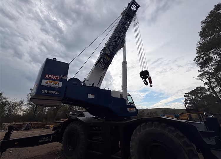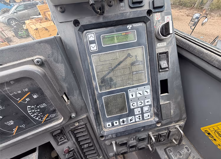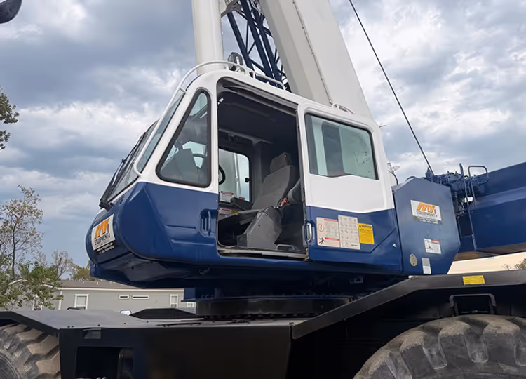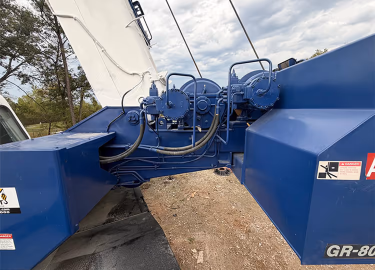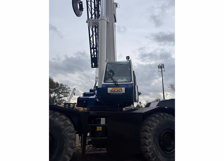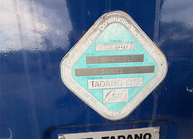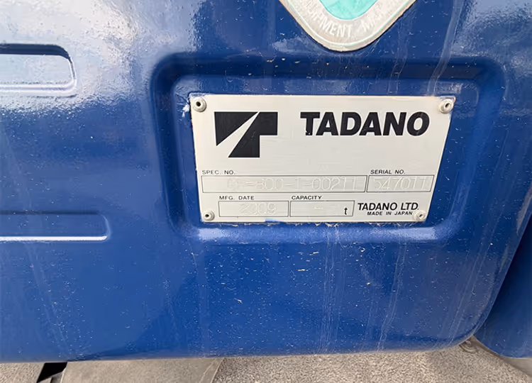 2009 Tadano GR800XL-1 Rough Terrain Crane; Boom: Five section full power synchronized telescoping boom, 37.7'~144.4', of hexagonal box construction with 7 sheaves; Jib: two stage bi-fold lattice type with 3.5, 25, or 45 degree offset (tilt type); single sheave, at the head of both jib sections; stored alongside base boom section; jib length is 32.5' or 58.1'; assist cylinders for mounting and stowing; Mitsubishi 6M60-TLA3B 267 hp diesel engine; full automatic transmission; 6 forward and 2 reverse speeds, constant mesh: 3 speeds - high range - 2 wheel drive; 4 wheel drive; 3 speeds - low range - 4 wheel drive; Travel Speed: 25 mph; Axle: front: full floating type, steering and driving; Rear: full floating type, steering and driving and non-spin rear differential; four steering nodes available: 2 wheel front, 2 wheel rear, 4 wheel coordinated and 4 wheel crab; Cab and Controls: left side, steel construction with sliding door; door window is powered control; tilt-telescoping steering wheel; adjustable control lever stands; 3-way adjustable operator's seat; hot water cab heater; air conditioning; Tadano electronic Load Moment Indicator system (AML-L): control lever lockout function; driving axle 2-way selected type by manual switch, 4x2 front drive, 4x4 front and rear drive.