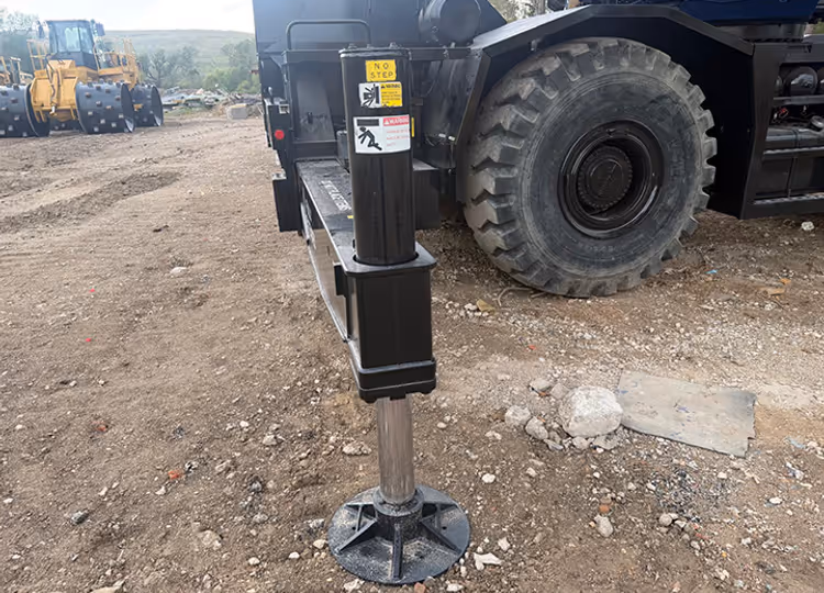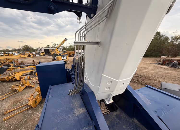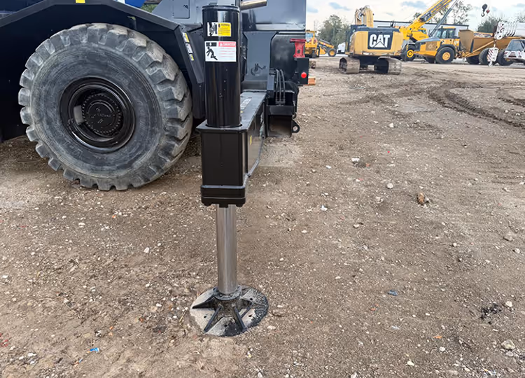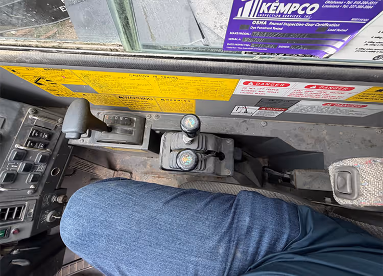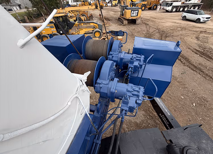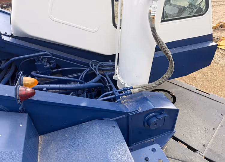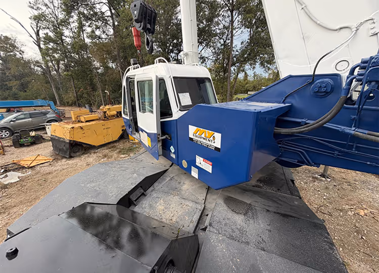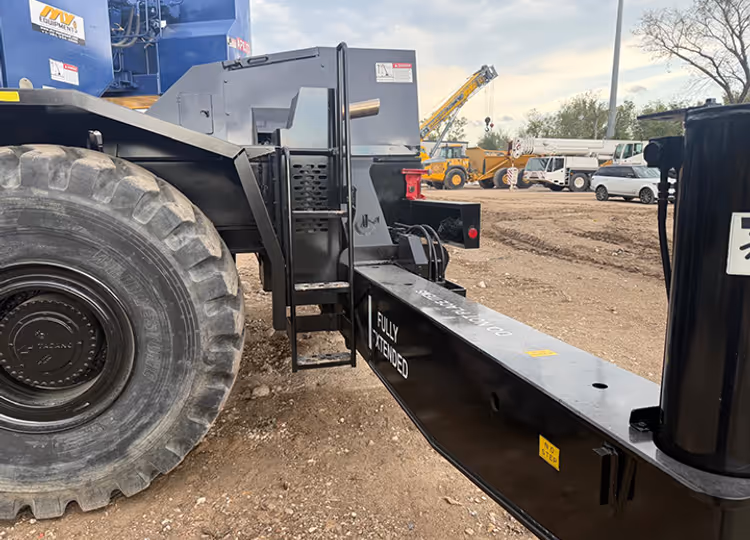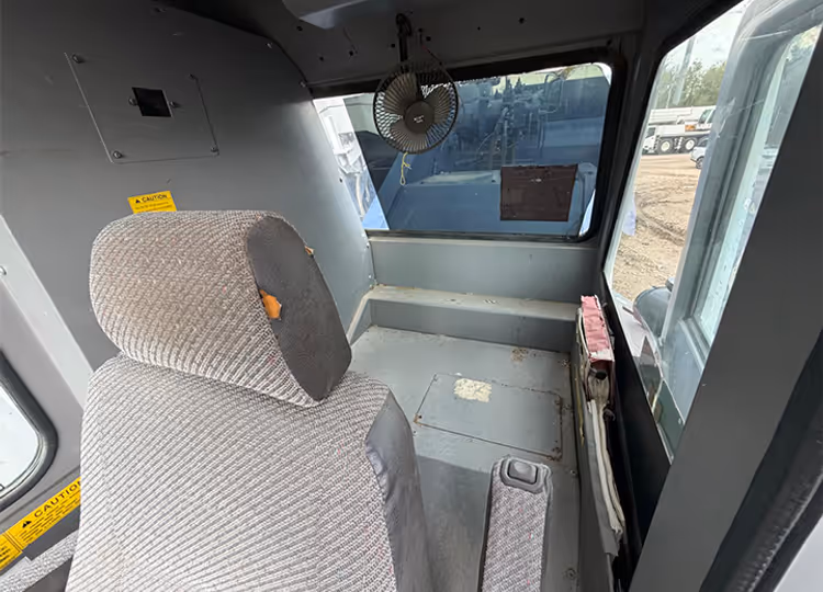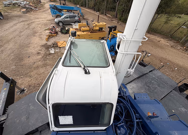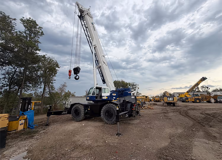 2009 Tadano GR800XL-1 Rough Terrain Crane; Boom: Five section full power synchronized telescoping boom, 37.7'~144.4', of hexagonal box construction with 7 sheaves; Jib: two stage bi-fold lattice type with 3.5, 25, or 45 degree offset (tilt type); single sheave, at the head of both jib sections; stored alongside base boom section; jib length is 32.5' or 58.1'; assist cylinders for mounting and stowing; Mitsubishi 6M60-TLA3B 267 hp diesel engine; full automatic transmission; 6 forward and 2 reverse speeds, constant mesh: 3 speeds - high range - 2 wheel drive; 4 wheel drive; 3 speeds - low range - 4 wheel drive; Travel Speed: 25 mph; Axle: front: full floating type, steering and driving; Rear: full floating type, steering and driving and non-spin rear differential; four steering nodes available: 2 wheel front, 2 wheel rear, 4 wheel coordinated and 4 wheel crab; Cab and Controls: left side, steel construction with sliding door; door window is powered control; tilt-telescoping steering wheel; adjustable control lever stands; 3-way adjustable operator's seat; hot water cab heater; air conditioning; Tadano electronic Load Moment Indicator system (AML-L): control lever lockout function; driving axle 2-way selected type by manual switch, 4x2 front drive, 4x4 front and rear drive.