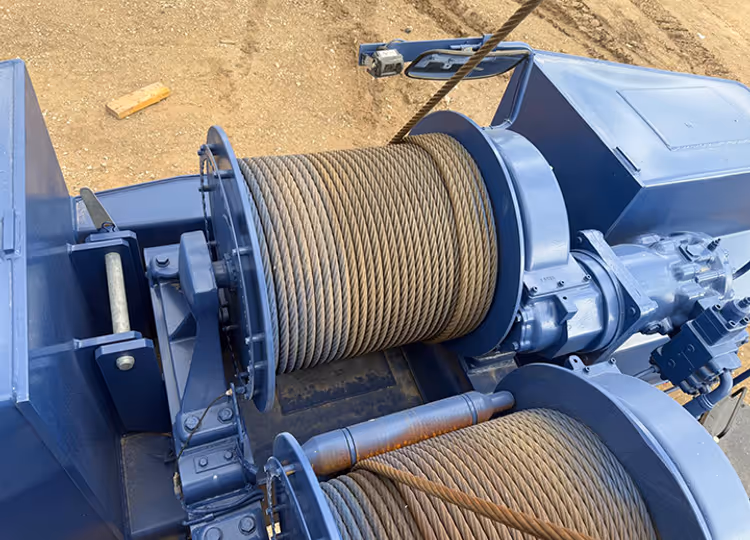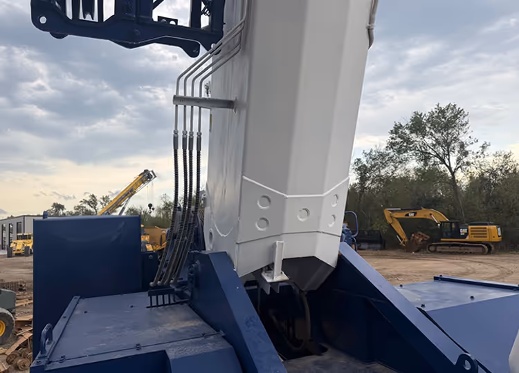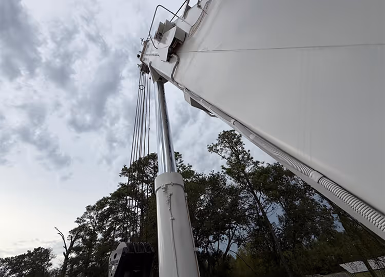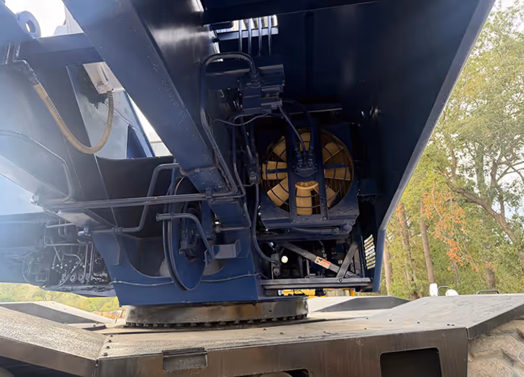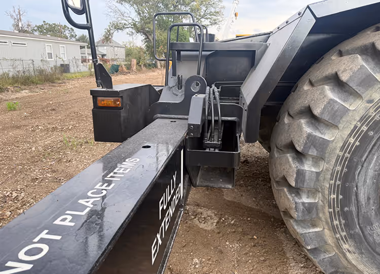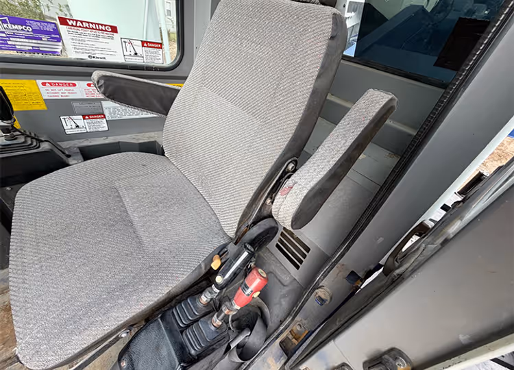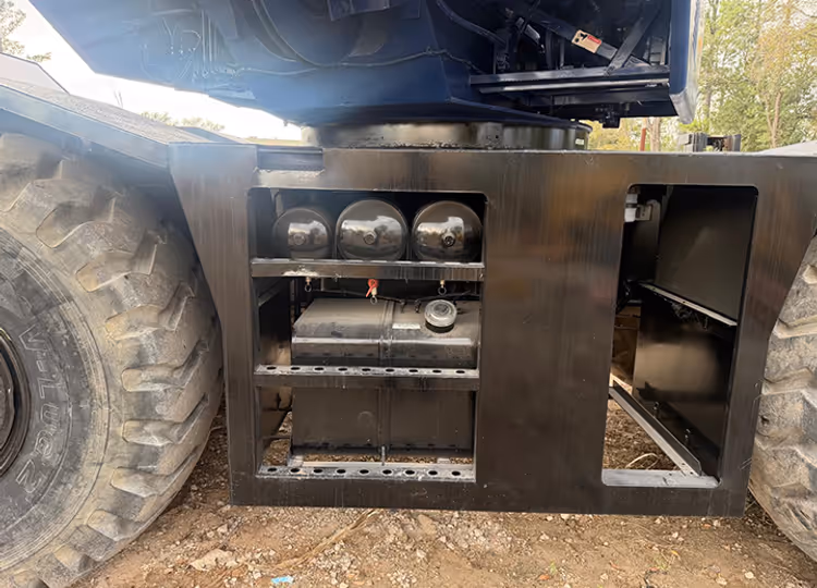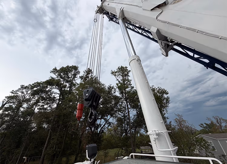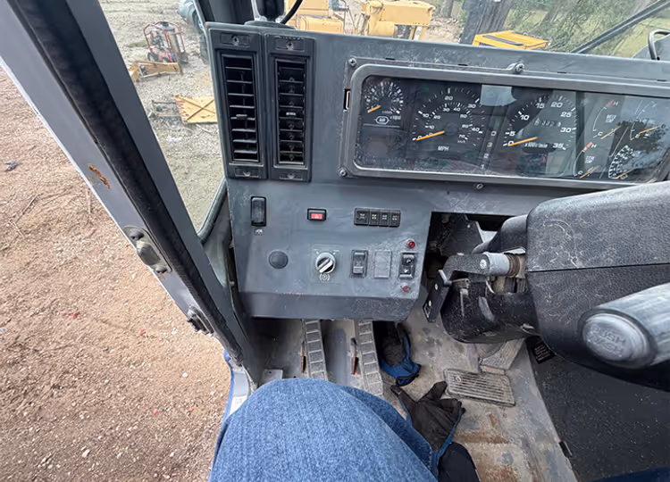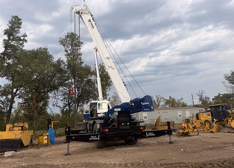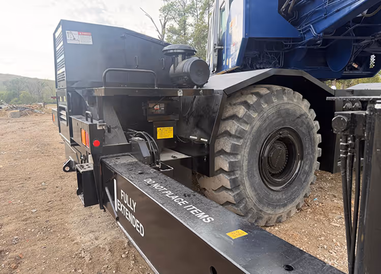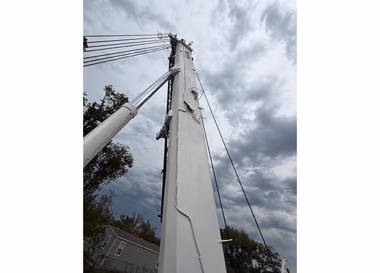 2009 Tadano GR800XL-1 Rough Terrain Crane; Boom: Five section full power synchronized telescoping boom, 37.7'~144.4', of hexagonal box construction with 7 sheaves; Jib: two stage bi-fold lattice type with 3.5, 25, or 45 degree offset (tilt type); single sheave, at the head of both jib sections; stored alongside base boom section; jib length is 32.5' or 58.1'; assist cylinders for mounting and stowing; Mitsubishi 6M60-TLA3B 267 hp diesel engine; full automatic transmission; 6 forward and 2 reverse speeds, constant mesh: 3 speeds - high range - 2 wheel drive; 4 wheel drive; 3 speeds - low range - 4 wheel drive; Travel Speed: 25 mph; Axle: front: full floating type, steering and driving; Rear: full floating type, steering and driving and non-spin rear differential; four steering nodes available: 2 wheel front, 2 wheel rear, 4 wheel coordinated and 4 wheel crab; Cab and Controls: left side, steel construction with sliding door; door window is powered control; tilt-telescoping steering wheel; adjustable control lever stands; 3-way adjustable operator's seat; hot water cab heater; air conditioning; Tadano electronic Load Moment Indicator system (AML-L): control lever lockout function; driving axle 2-way selected type by manual switch, 4x2 front drive, 4x4 front and rear drive.